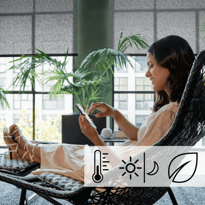 Unsere maßgefertigten Innenrollos mit MotionBlinds-Technologie passen sich automatisch Ihrem Tagesablauf an – auch wenn Sie nicht zu Hause sind. So genießen Sie rund um die Uhr die ideale Lichtstimmung und Temperatur in Ihrem Zuhause.